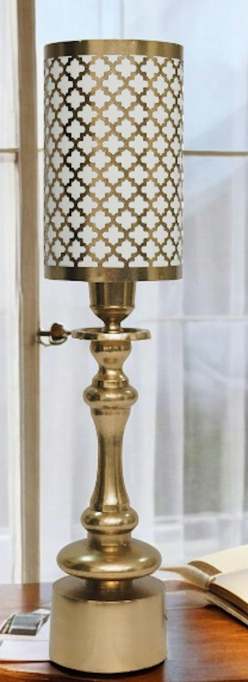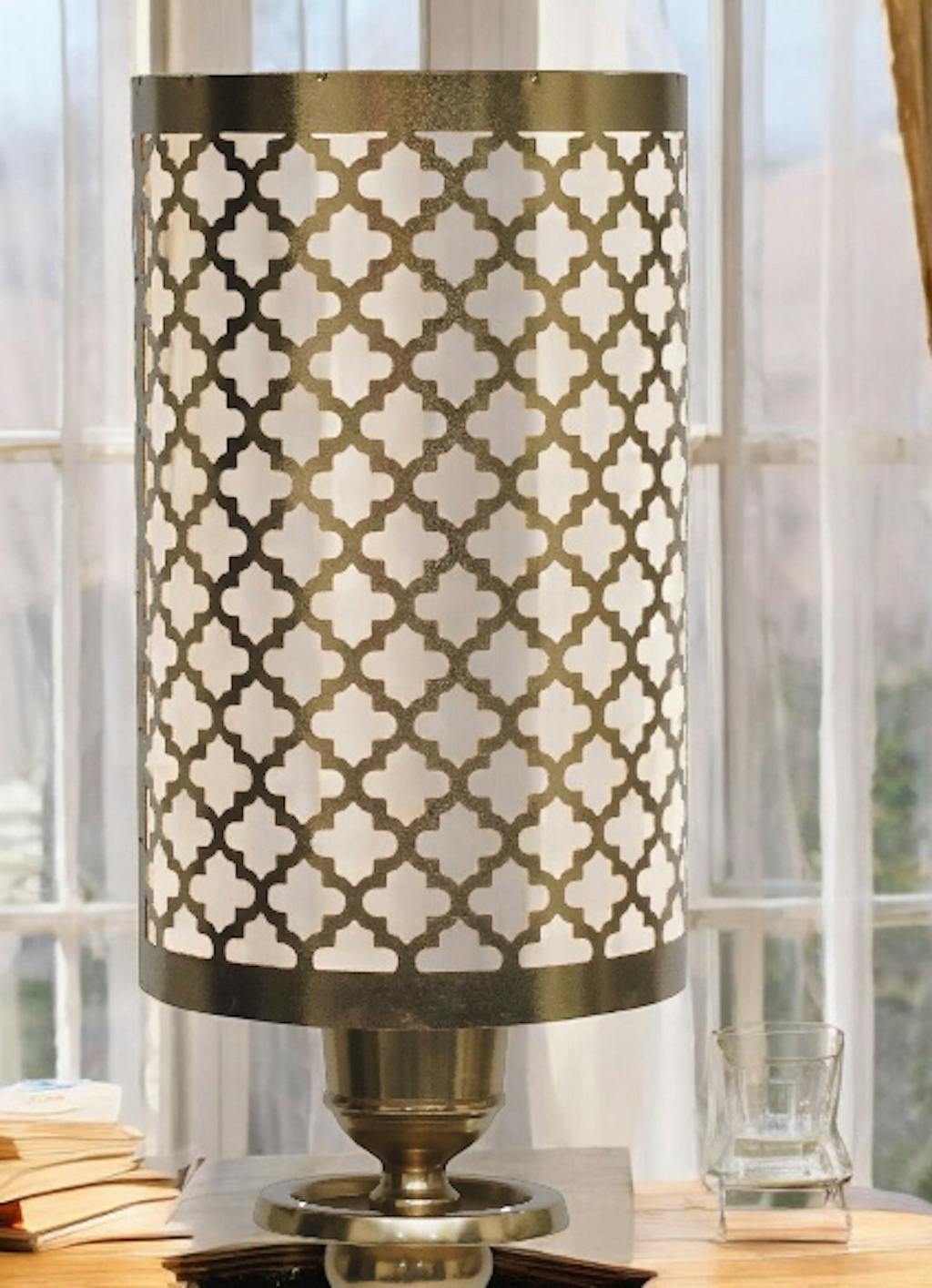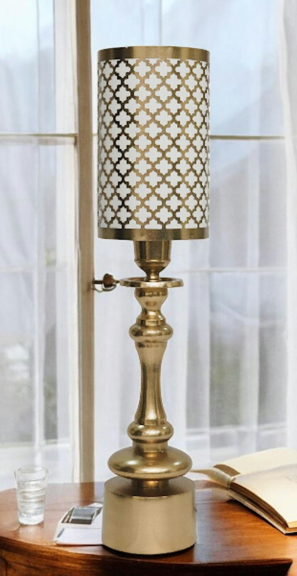 An elegant tall, white and gold cutwork lamp